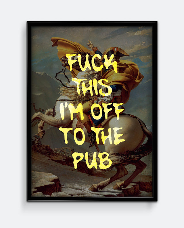 Bold, irreverent, and unapologetically funny, this altered artwork reimagines the iconic equestrian portrait of Napoleon with a modern attitude. Overlaid with the phrase “fuck this, I’m off to the pub,” the dramatic, heroic scene is transformed into a humorous statement of everyday rebellion.