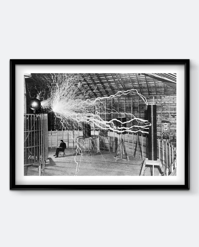 Bring a spark of genius to your walls with this striking black-and-white art print featuring inventor Nikola Tesla in his Colorado Springs laboratory. The iconic image captures Tesla calmly seated as bolts of electricity arc dramatically around him — a powerful symbol of innovation, creativity, and brilliance. Perfect for science enthusiasts, engineers, or anyone who appreciates bold, thought-provoking decor.