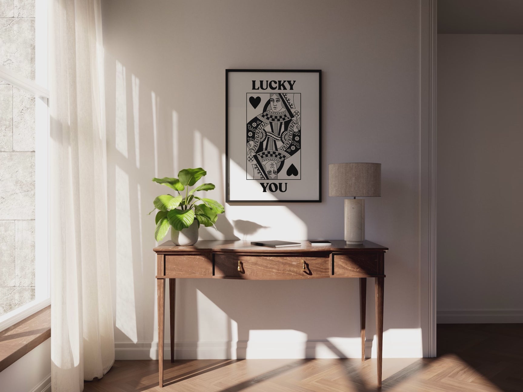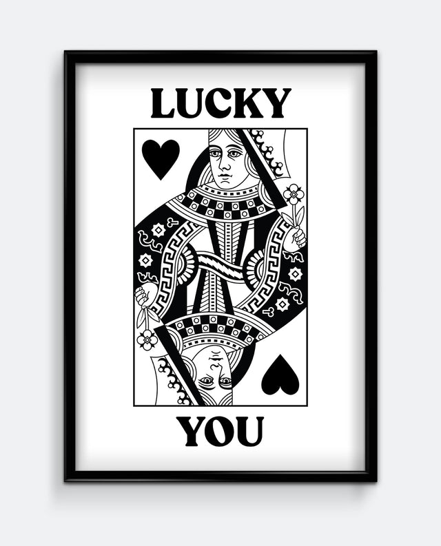 This “Lucky You” art print is a striking fusion of classic playing card design and modern minimalism. The Queen of Hearts is reimagined in monochrome with bold text, making it the perfect gift for a loved one or a stylish addition to your own collection. Whether it’s for Valentine’s Day, an anniversary, or simply to say “you’re one in a million,” this print is a playful reminder of how lucky we are to have the people we love.